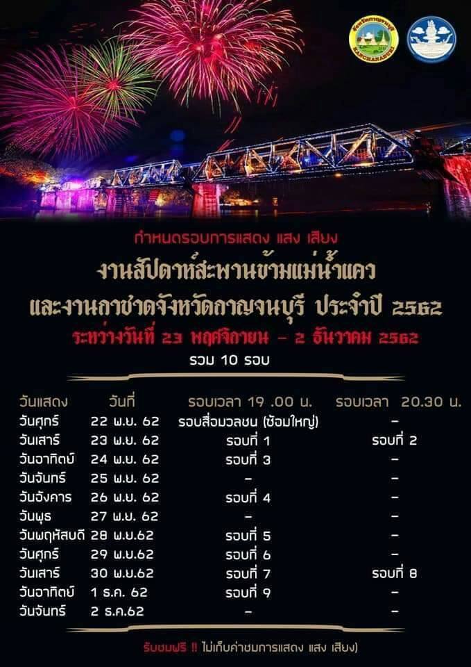 กำหนดรอบการแสดง แสง เสียง... งานสัปดาห์สะพานแม่น้ำแควและงานกาชาดจังหวัดกาญจนบุรี ประจำปี 2562