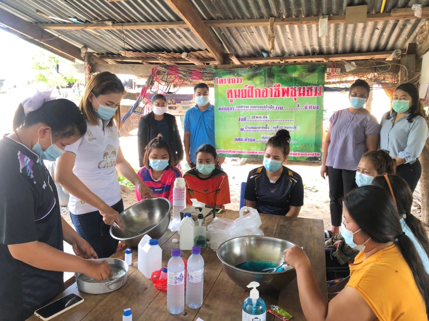 วันที่ 18 พฤษภาคม 2564 นางศรัณย์พัทธ์ เพ็ญปัญญา ผู้อำนวยการ กศน.อำเภอเลาขวัญ มอบหมายให้ นายฐาปกรณ์ น้ำใจสุข ครู กศน. ตำบลทุ่งกระบ่ำ จัดกิจกรรมศูนย์ฝึกอาชีพชุมชน กลุ่มสนใจ วิชาการทำเจลแอลกอฮอล์ล้างมือ จำนวน 3 ชั่วโมง ณ บ้านหนองตากเนื้อ หมู่ 10 ตำบลทุ่งกระบ่ำ อำเภอเลาขวัญ จังหวัดกาญจนบุรี โดยมี นางศรัณย์พัทธ์ เพ็ญปัญญา และนางพัชริน สิมลี เป็นผู้นิเทศ กิจกรรมดังกล่าว