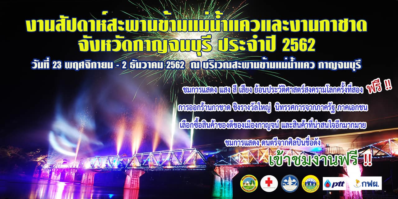 จังหวัดกาญจนบุรีเชิญร่วมชมการแสดงแสงสีเสียง ชื่อชุดสะพานข้ามแม่น้ำแควรอยจารึกสู่สันติภาพในงานสัปดาห์สะพานข้ามแม่น้ำแควและงานกาชาดจังหวัดกาญจนบุรี พิเศษปีนี้เข้าชมการแสดง แสง สี เสียง ฟรี!!